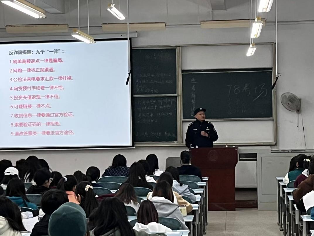 宣讲活动中,五位警官进到班级,介绍常见电信诈骗类型,揭示诈骗手法,解析诈骗案例,同时与在场学生面对面交流,进行防骗提示,提升学生自我保护能力。此外,号召学生树立理性科学的消费观,养成朴素节约的优秀品质,积极学习金融和网络安全知识,远离不良网贷行为。