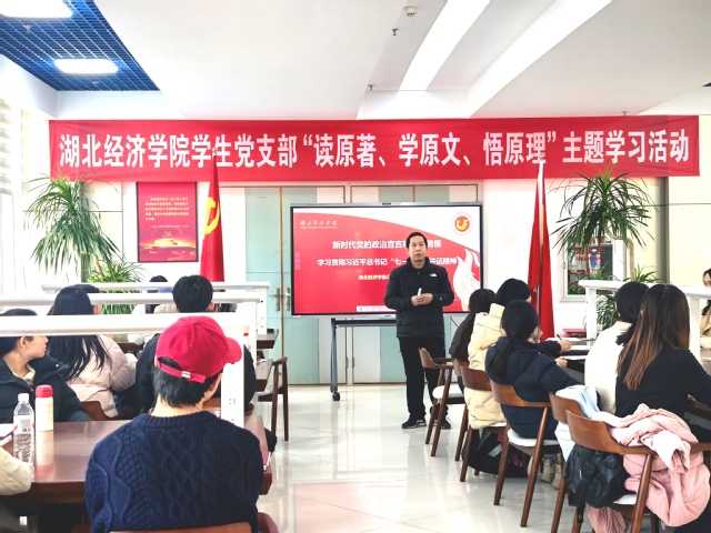 本网讯(通讯员:杨佳子)1月9日下午,由学校党委组织部、学生工作部、图书馆、马克思主义学院联合主办、威尼斯5139手机版承办的第五期“读原著、学原文、悟原理”主题学习活动,在图书馆马克思主义书房顺利举行。马克思主义学院朱宝林副教授应邀主讲,威尼斯5139手机版学生党总支副书记杨佳子、研究生第三党支部和本科生第三党支部全体党员参加了本次活动。