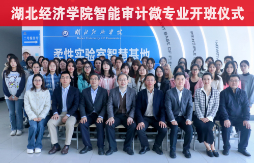 最后,所有参会人员合影留念。本次仪式的成功召开,象征着智能审计微专业的正式开班,明确了微专业的学习方向和学习重点,为智能审计微专业的后续发展打下了坚实基础。