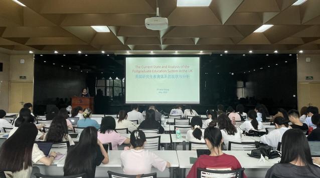张洁教授从教学资源、专业选择、学生研究能力培育、文化交流等多个层面,解析了英国研究生教育体系具有多元课程、研究导向、国际视野等特性,同时,她也从侧面阐述了英国研究生教育存在入学申请难度大、学费较高等不足之处,并与国内高校研究生教育进行了对比分析,进一步拓宽了研究生们对于学历教育的认知视野。