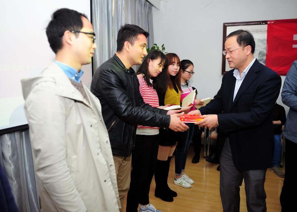 何光彩为教工党员、学生代表发放新的《中国共产党章程》、《党十九大报告辅导读本》和《习近平总书记关于高等教育重要论述摘编》等学习资料。