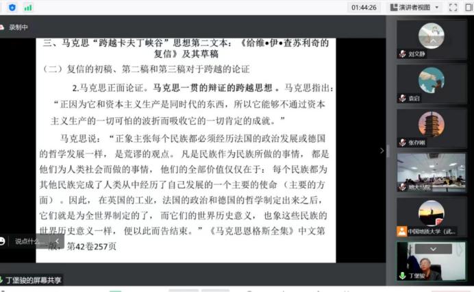 在本次报告中,丁堡骏教授介绍了马克思“跨越卡夫丁峡谷”思想的时代背景,解读了马克思关于俄国社会“跨越卡夫丁峡谷”理论的两个重要文本——《给<祖国纪事>杂志编辑部的信》和《给维·伊·查苏利奇的复信》及其草稿。他详细分析了两个文本的写作目的、主要内容、基本思想、论证过程、理解上的难点、要解决的问题等。最后,丁堡骏教授从理论意义、实践意义和方法论意义三个层面探讨了马克思“跨越卡夫丁峡谷”思想的当代价值。