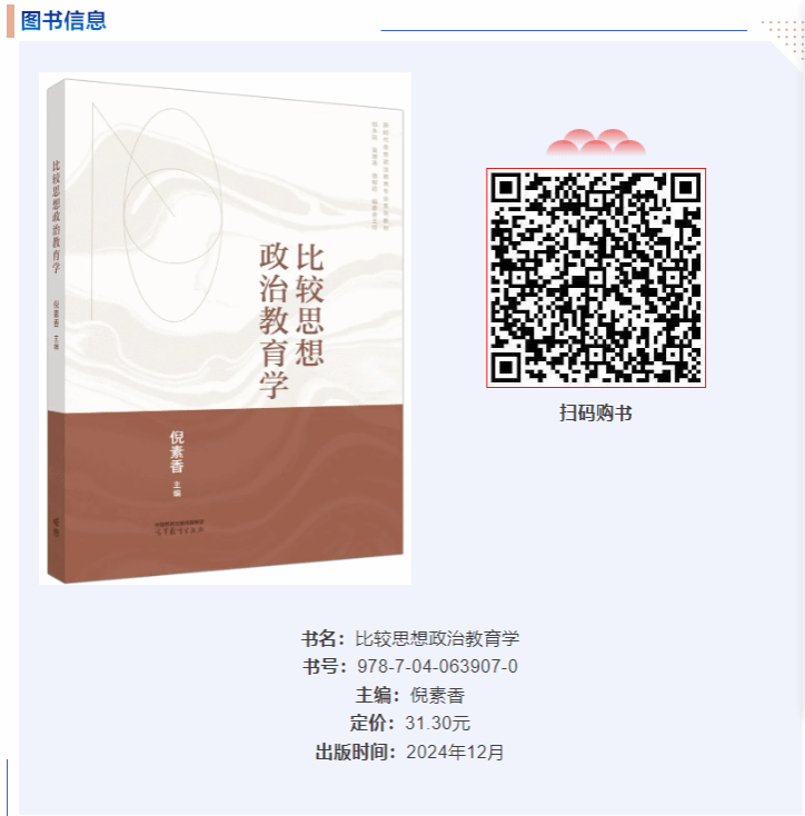 近日,由武汉大学倪素香教授主编,beat365官网傅安洲教授等担任副主编的《比较思想政治教育学》一书由高等教育出版社出版发行。本书是新时代思想政治教育专业系列教材之一,也是高等教育出版社策划的面向思想政治教育专业本科生的系列教材之一。该书坚持以马克思主义为指导,着眼当代国内外思想政治教育发展前沿、内容编排系统全面、作者团队专业权威,具有专题性、综合性、前沿性。