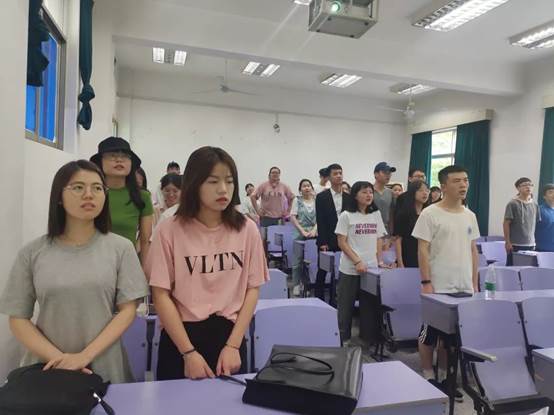 在主持人的带领下,全体起立共同唱响团歌《光荣啊,中国共青团》。之后由181181团支部成员权昊楠领誓,全体与会成员重温入团誓词。