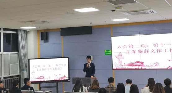 由学生会主席蔡薛文向大家总结汇报2018-2019学年学生会工作,他对学生会具体工作作了详细的介绍,使参加大会的全体人员对院学生会过去一年的工作有了一定的了解。