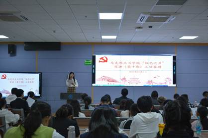 活动伊始,主持人先对第十期“红色之声”宣讲活动的主题和意义进行了介绍,随后介绍了参与本次活动的评委和立项答辩会的答辩形式,此次答辩采用“4+2+3”模式,即四分钟PPT展示立项答辩、两分钟模拟宣讲及三分钟的评委提问。