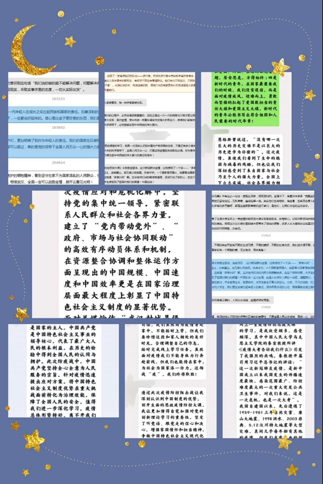 这次思政大课,这场疫情,当让我们有所思考,有所领悟,有所担当。19级本科生郭宏伟同学总结了三点他的思考:第一,这次疫情让我们知道我们必须要与自然和谐相处,这次疫情与其说是灾难不如说是大自然给人类的一次警示,我们需要敬畏、尊重、顺应和保护大自然,这样自然才会慷慨地回报我们人类社会;第二,这次疫情中展现了中国特色社会主义集中力量办大事的独特优势,我们要对我国的制度产生自信,坚持中国特色社会主义发展方向;第三,这次防疫抗疫中出现了许多青年人的身影,以前是先辈们保护我们,现在我们应该主动承担起青年人的责任,作为大学生,我们应该不断学习、居安思危、勤学奋斗,不断增长我们的才干,为社会为国家做出更多的贡献。