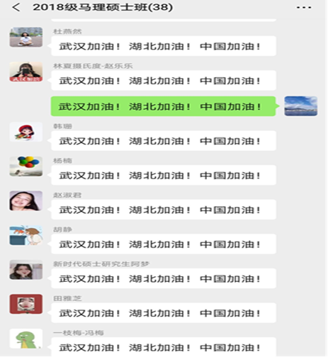 自学院上传《关于组织开展新冠肺炎疫情防控主题班会的指导方案》文件后,就得到了2019级马克思主义理论硕士班的强烈支持,经过几天的精心准备,于3月6日晚7点开展了本次班会,全体同学积极参加,主要内容有两部分,一是认真学习了新冠肺炎防控的相关知识,包括新型冠状病毒简介、新型冠状病毒感染病例诊疗方案、新型冠状病毒感染预防与治疗技术简介、新型冠状病毒感染病例诊断程序。二是每位同学积极发言,讲述了自己在疫情防控期间的心理状态和学习状态,同学们还是保持了积极面对的心理状态和“停课不停学”学习状态,认为疫情很快就会过去,认真学习才是我们应该关注与坚持的,通过大家的发言得知:大部分同学每周的专业课学习研究时间都能达到40个小时,并且在居家的环境中仍保持较高的学习效率,这是同学们在多年的求学历程中养成的良好品质,龙启航同学表示:疫情期间正是我们要认真学习的时间,是提高自身的好机会。