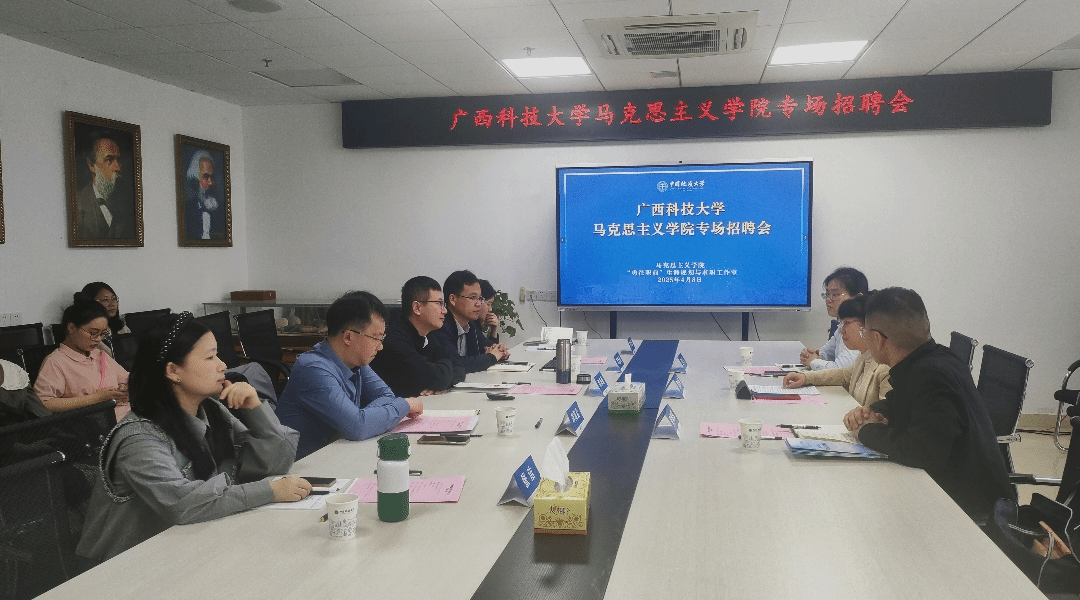 2025年4月8日,广西科技大学beat365英国官网网站党委书记覃雪梅,党委副书记、纪委书记夏辛萍,副院长梁炳辉来beat365官网宣传招聘。beat365官网党委书记魏海勇,党委副书记、纪委书记武彦斌,副院长李海金,思想道德与法治教研部主任张洁,思想政治教育系主任李胜蓝以及博士生代表参加专场招聘会。副院长李海金主持会议。