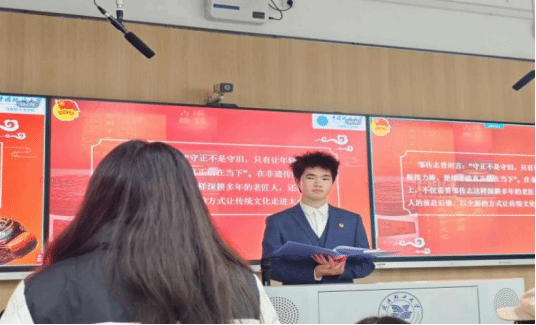 然后,徐文祥同学以李子柒利用短视频平台成功传播漆艺为例,深入剖析背后的时代助力与政策支持,鼓舞同学们用新思维、新媒介讲述非遗故事,弘扬中华优秀传统文化。邹传志、李子柒等传承者的实践,正是青年践行“第二个结合”与“三个原则”的生动写照,呼吁大家坚定文化自信,为古老非遗注入时代活力。