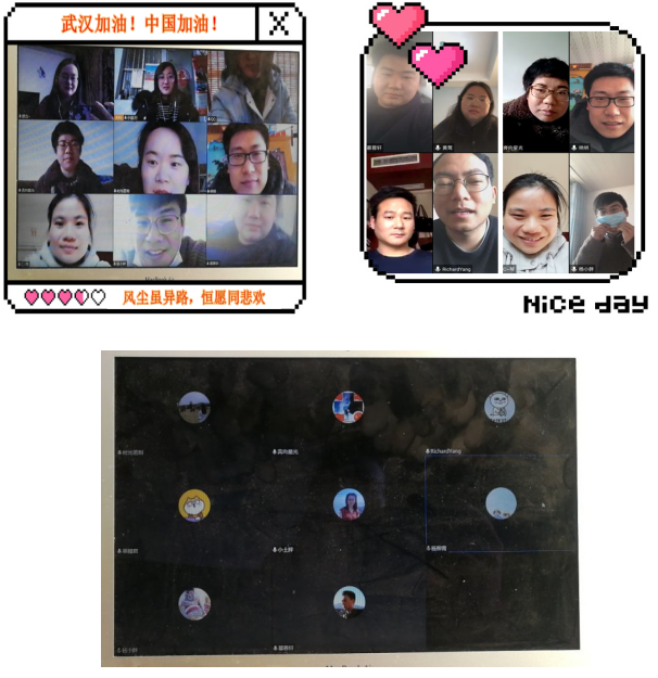 会议包含三个环节:1.大家汇报居家情况2.分别谈抗疫感受3.手写“武汉加油”表达支持。