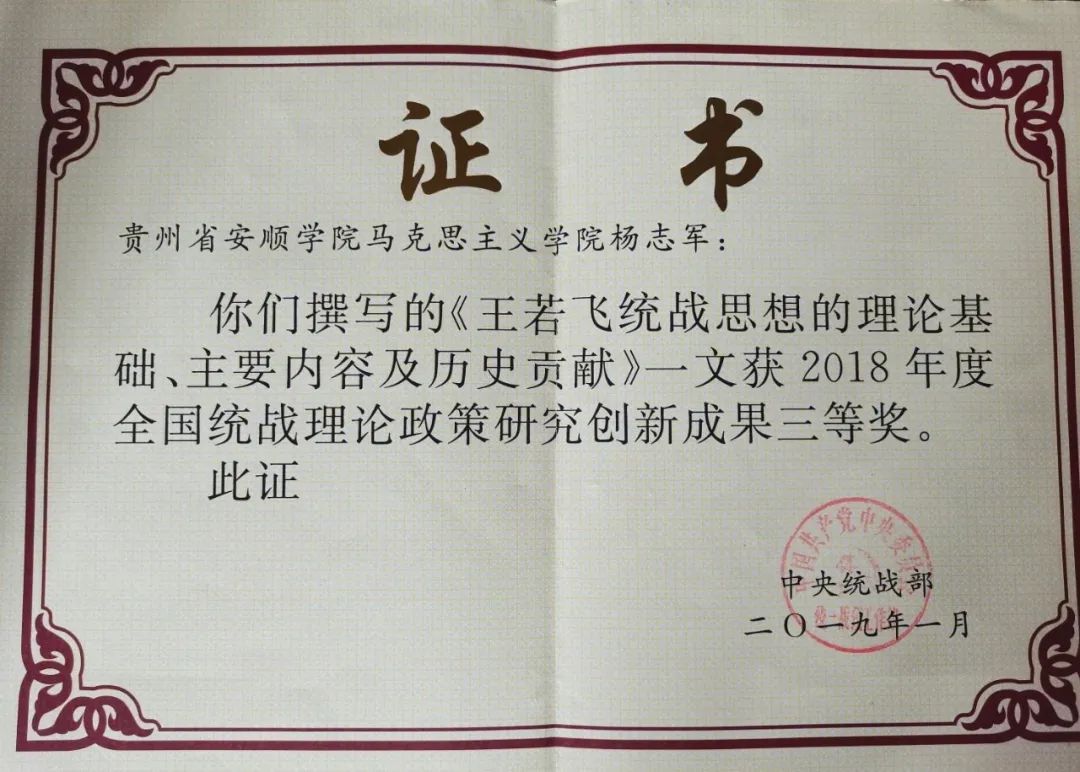 杨志军校友论文《王若飞统战思想的理论基础、主要内容及历史贡献》获奖证书