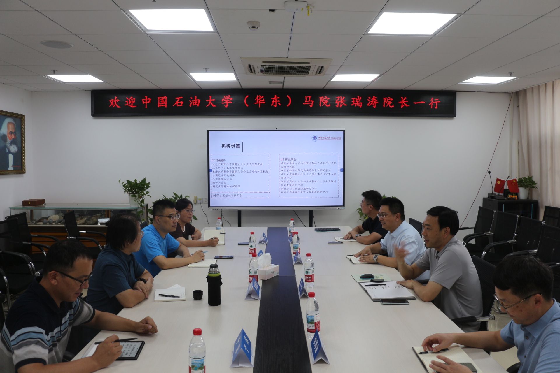 阮一帆院长对张瑞涛院长一行来校表示欢迎,重点介绍了beat365官网的发展历程、机构设置、师资队伍、思政课建设、学院发展思路、省级重点马院建设和人才培养等特色经验。石油大学张瑞涛院长一行也分别介绍了马院的发展思路以及学科特色上的探索经验。